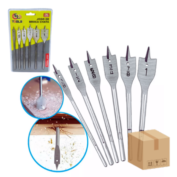 Descrição: Jogo de broca chata com 6 peças. Ideal para furar madeira. Sua ponta piloto, geralmente equipada com uma rosca, evita deslizamento e proporciona uma tração maior, o que produz uma perfuração mais rápida.