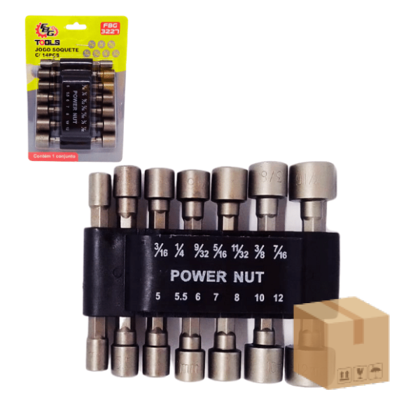 Descrição: Jogo soquete com 14 peças. Aço cromo vanádio tratado com jato de areia e tratado termicamente. Adapta-se a todas as furadeiras elétricas, parafusadoras, drivers sem fio e magnéticos. Tamanhos: 3/16; 1/4; 9/32; 5/16; 11/32; 3/8; 7/16;