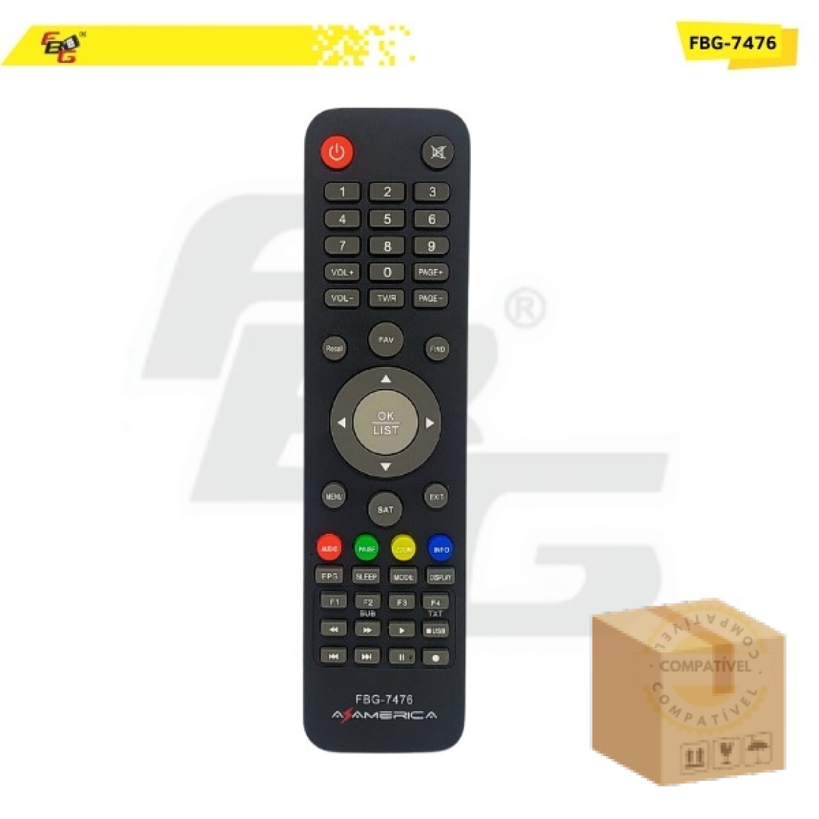 Controle Remoto compatível com Receptor Azamerica- Modelo FBG-7476 NCM: 8526.92.00 NCM: 8543.70.99 Observações: 1- Informamos que este controle remoto funciona por tecnologia infravermelha e, por isso, não necessita de homologação pela ANATEL, conforme regulamentação vigente.