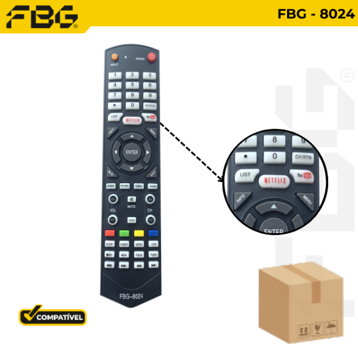 O Controle Remoto da FBG foi projetado para oferecer praticidade, qualidade e durabilidade. Fabricado com materiais de alta qualidade, ele possui teclas macias, plástico resistente e um LED transmissor com excelente tempo de resposta, garantindo uma experiência de uso rápida e eficiente.