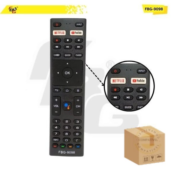 Compatibilidade: Controle remoto compatível com Tv Smart JVC - Possui as teclas: Netflix e Youtube. Principais modelos compatíveis: LT-32MB208 / LT-70MB508 / LT-65MB508 / M-C3329 / RM-C3329 Cor: Preto Pilhas: Não inclusas NCM: 8526.92.00 NCM: 8543.70.99 CÓDIGO GTIN: 7908671201579 Observações: 1- Informamos que este controle remoto funciona por tecnologia infravermelha e, por isso, não necessita de homologação pela ANATEL, conforme regulamentação vigente.