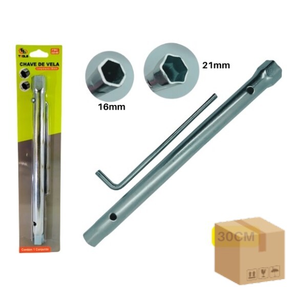 Descrição: Jogo chave de vela de 16mm e 21mm. Feita de aço, material de alta resistencia, ideal para substituir velas de ignição. Boca dupla de 16 e 21mm e comprimento de 300mm.