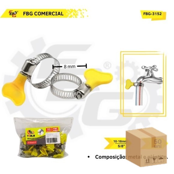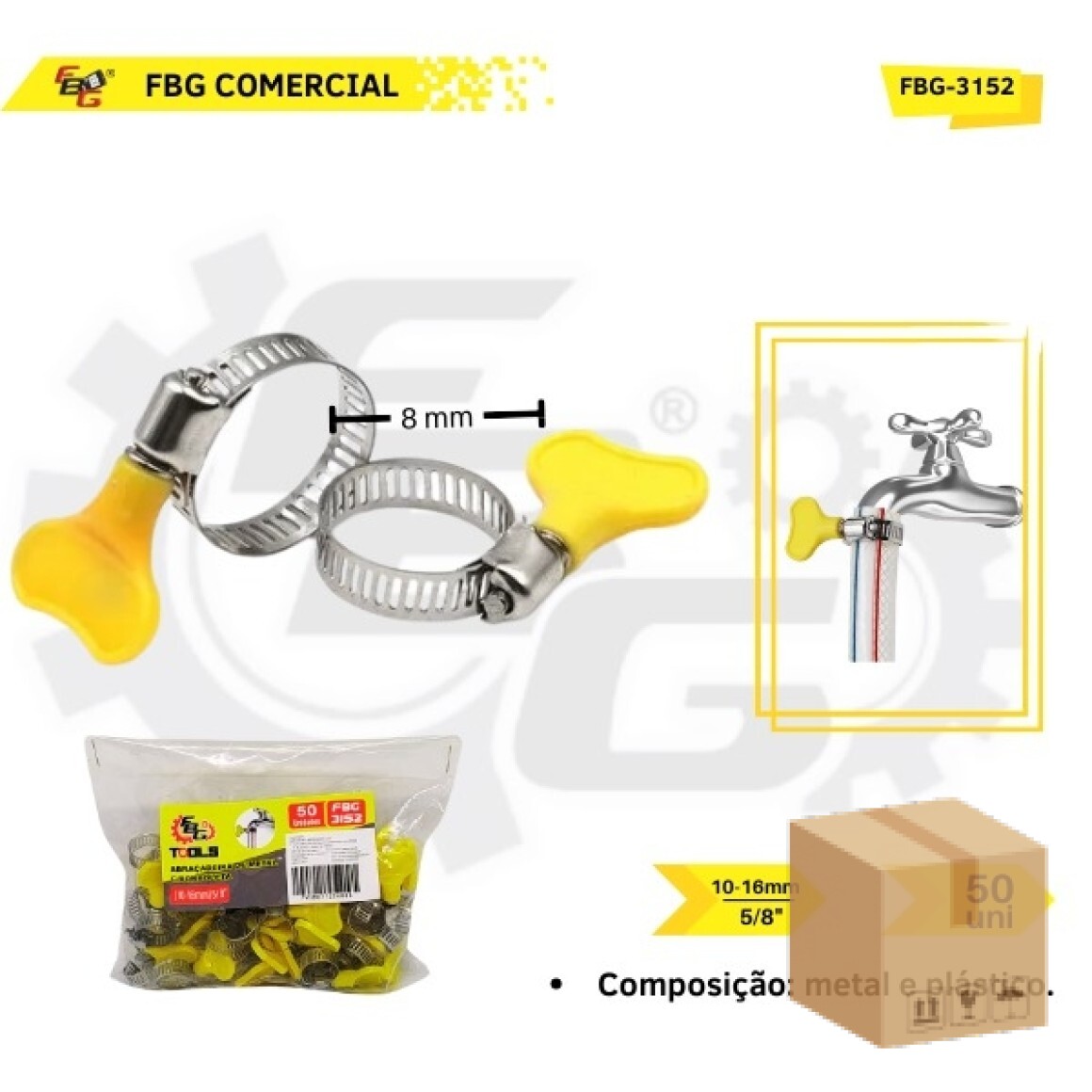 Descrição: Abraçadeira de metal com borboleta no tamanho 10-16mm - 5/8´´ Caixa com 20 pacotes contendo 50 unidades cada = 1.000 peças