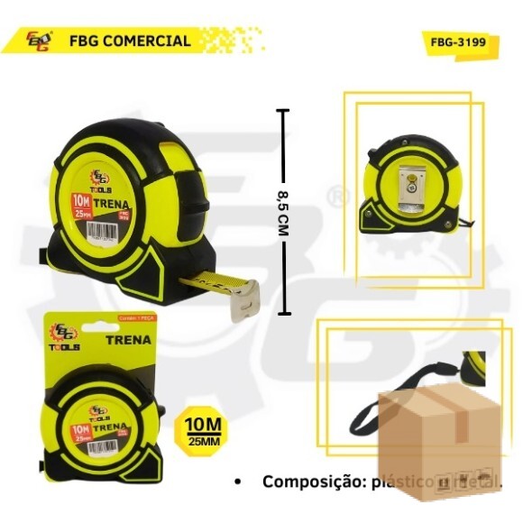 Descrição: Trena de 10M. Para medir com eficiência, a trena com fita de 25mm de 10M é a escolha certa.